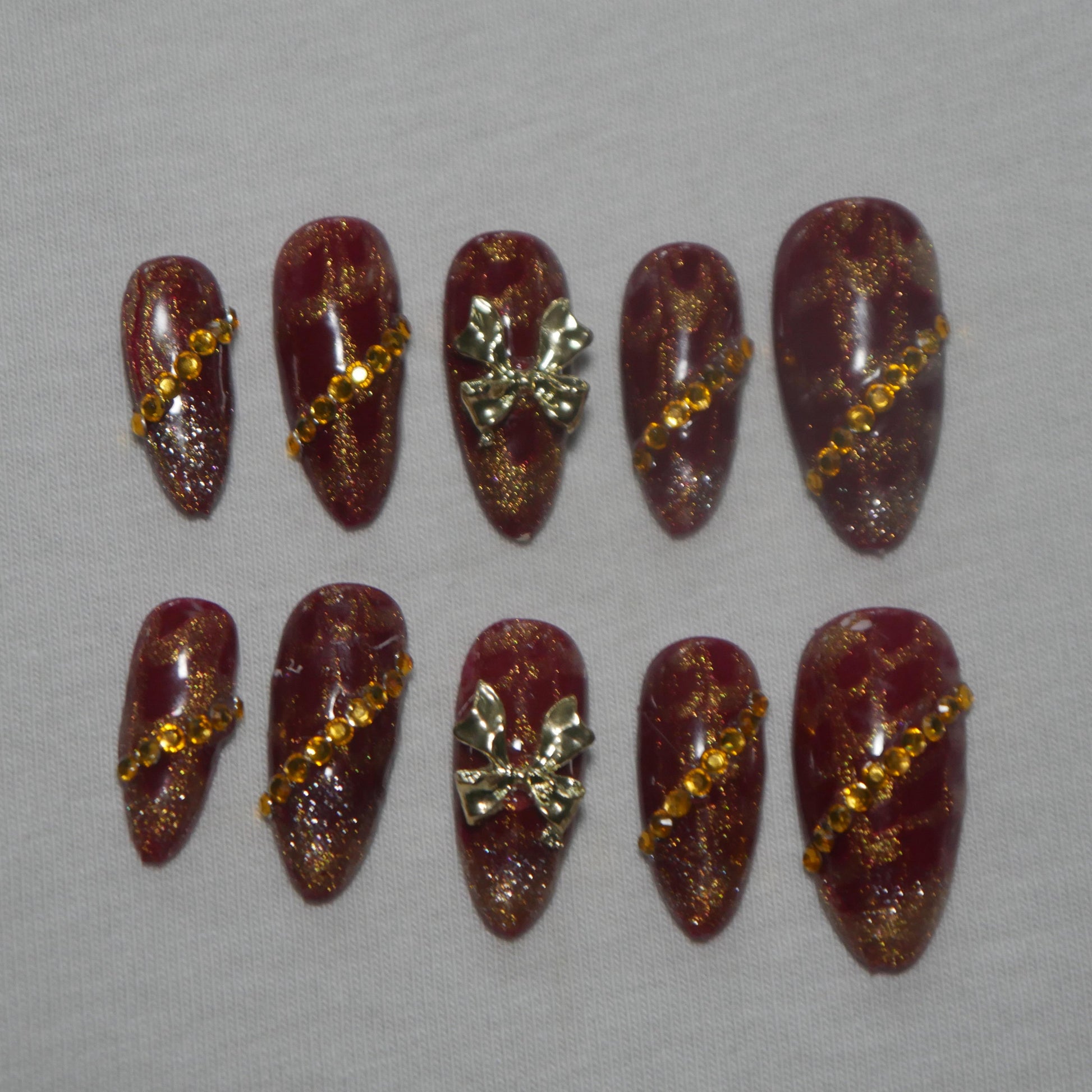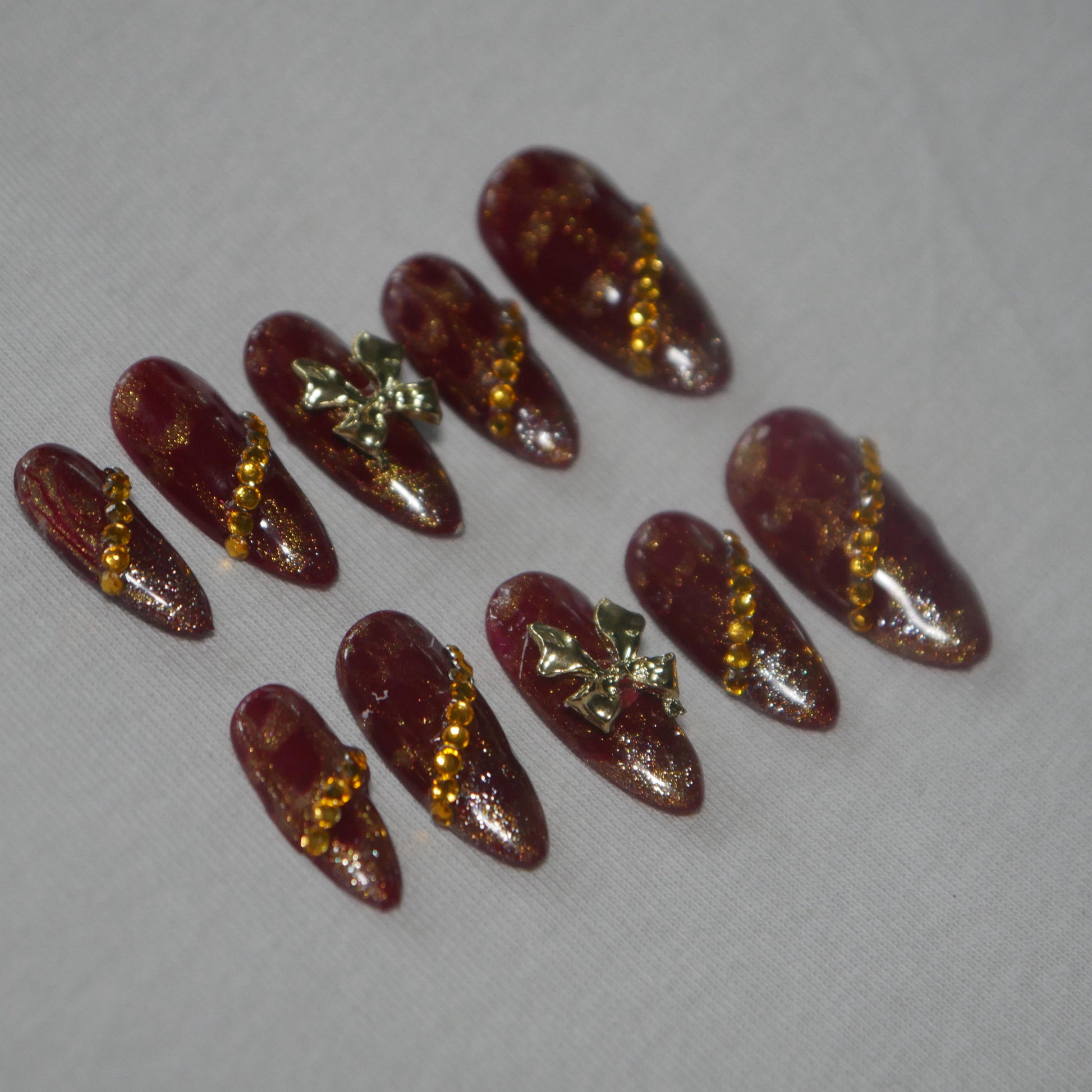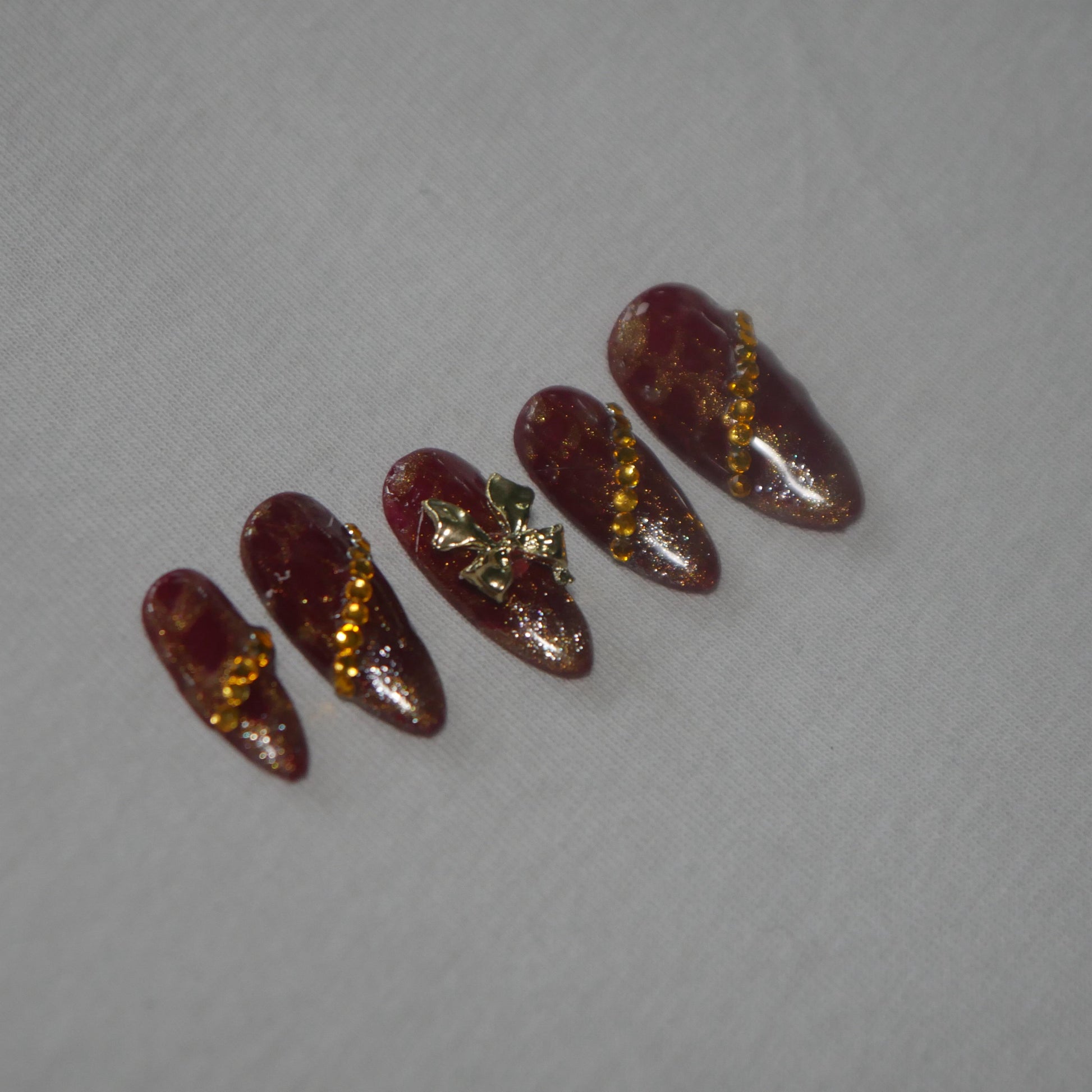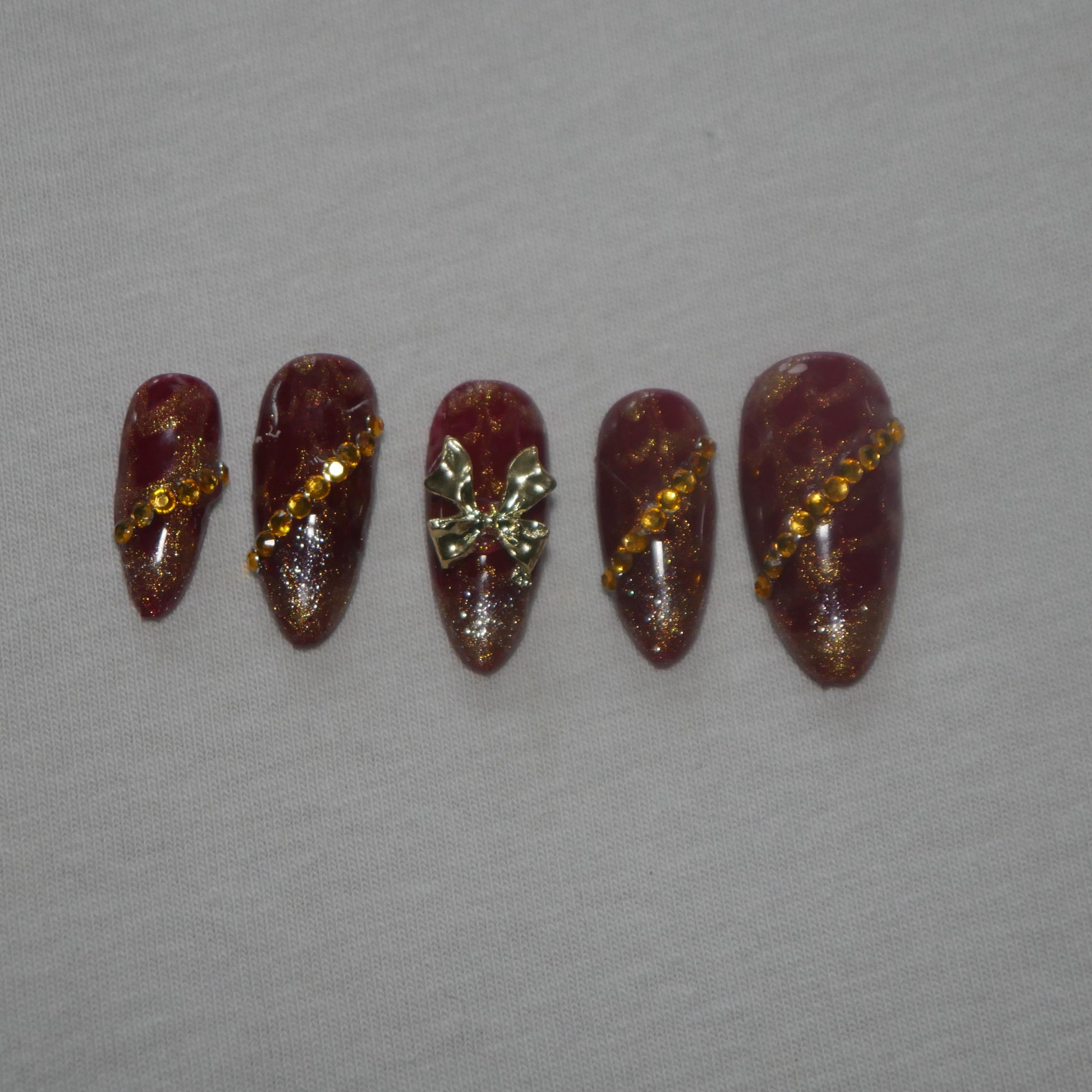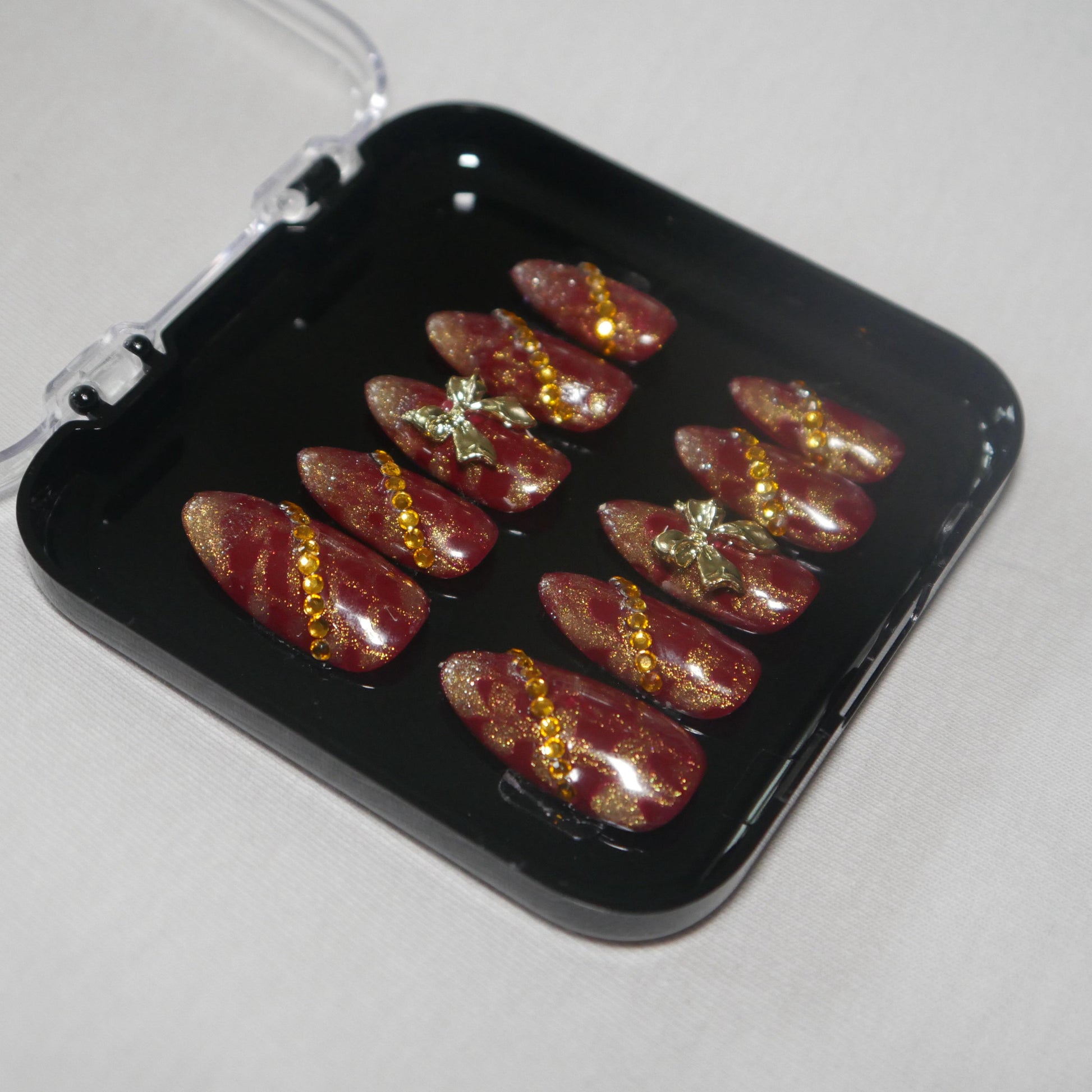 Bold, timeless, and undeniably glamorous — this statement set features a rich red base, adorned with intricate gold glitter patterns and luxurious gold embellishments, including delicate gemstones and a signature gold bow accent.