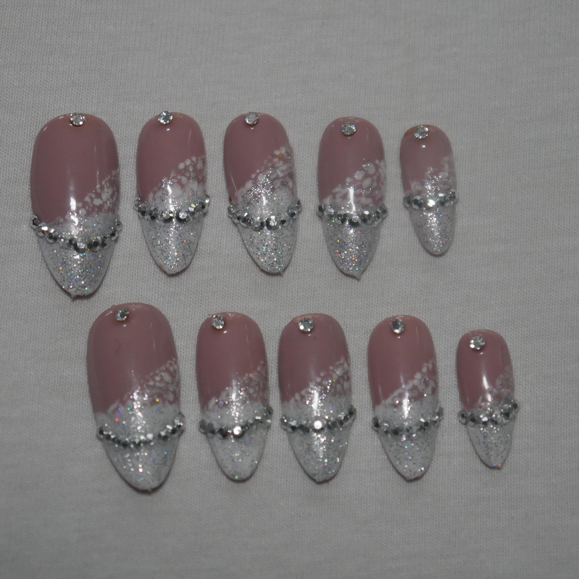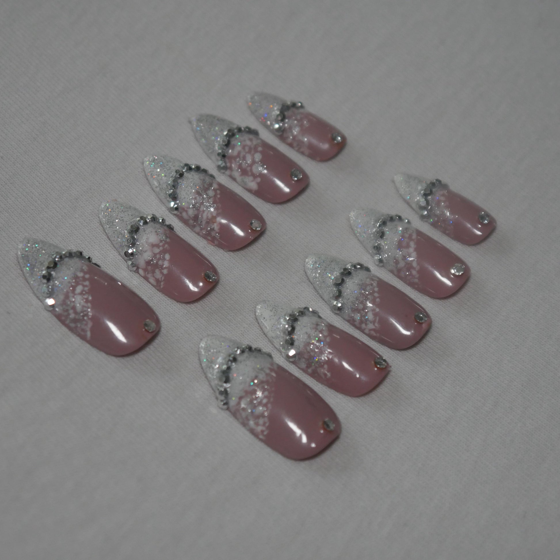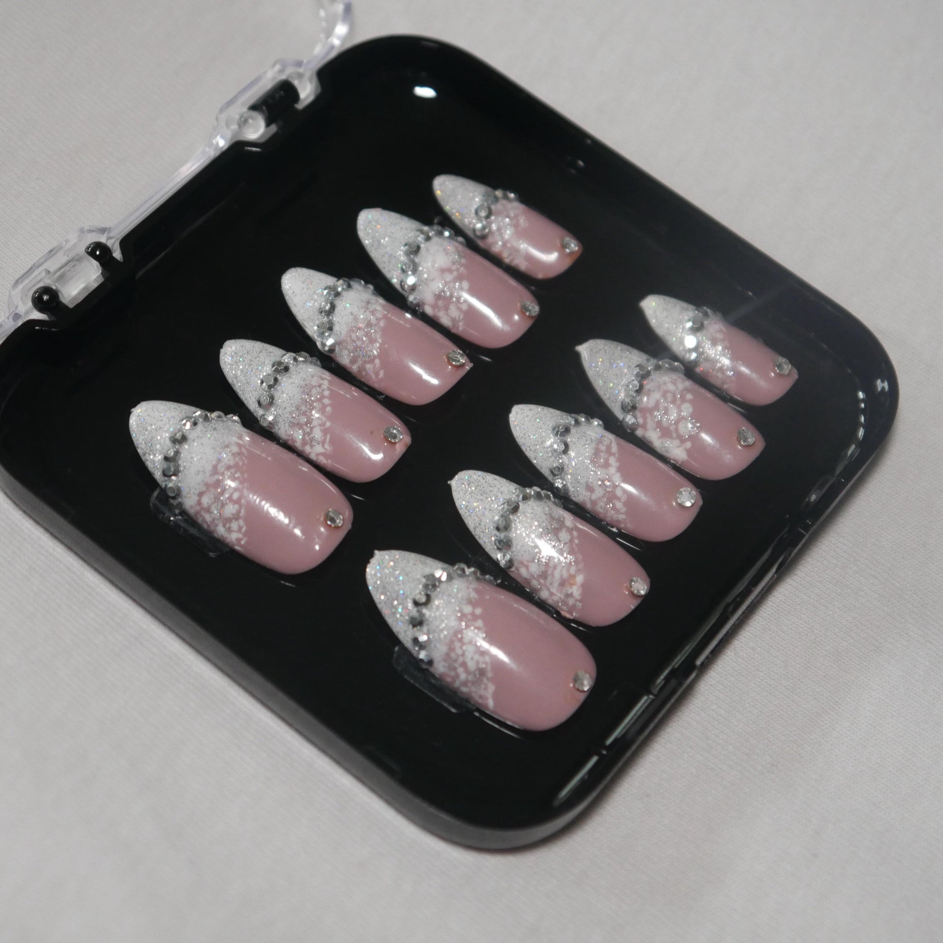 Refined, radiant, and unapologetically luxe — this press-on set brings elevated glam to every gesture. Featuring a soft nude-pink base, white sparkly tips, and delicately placed gemstone accents, these nails offer a flawless balance between elegance and edge.