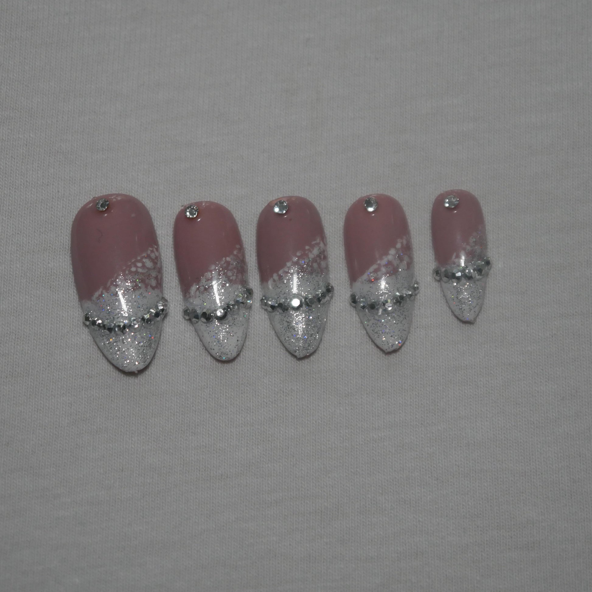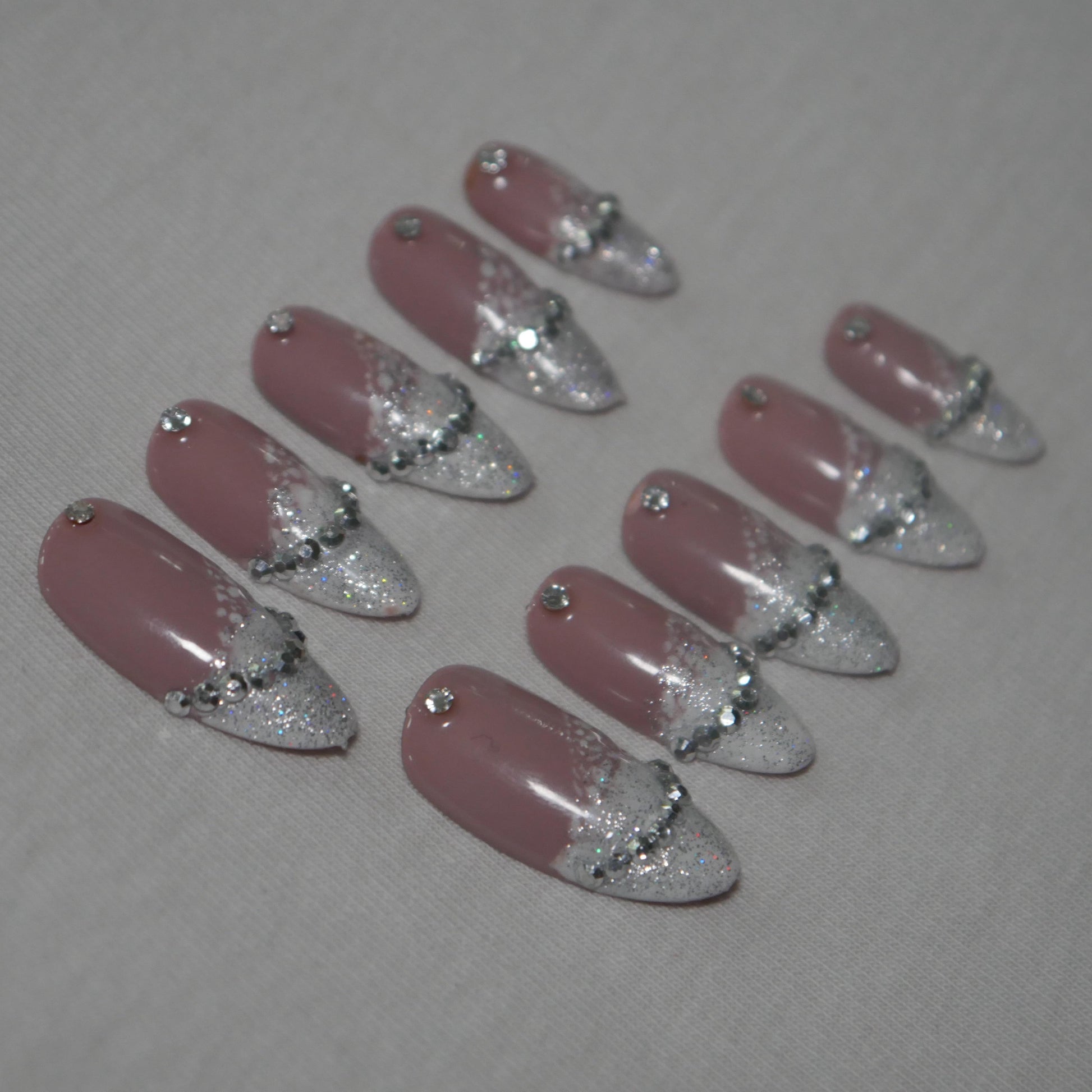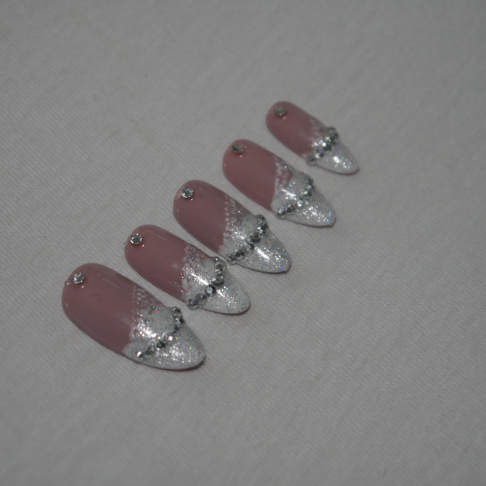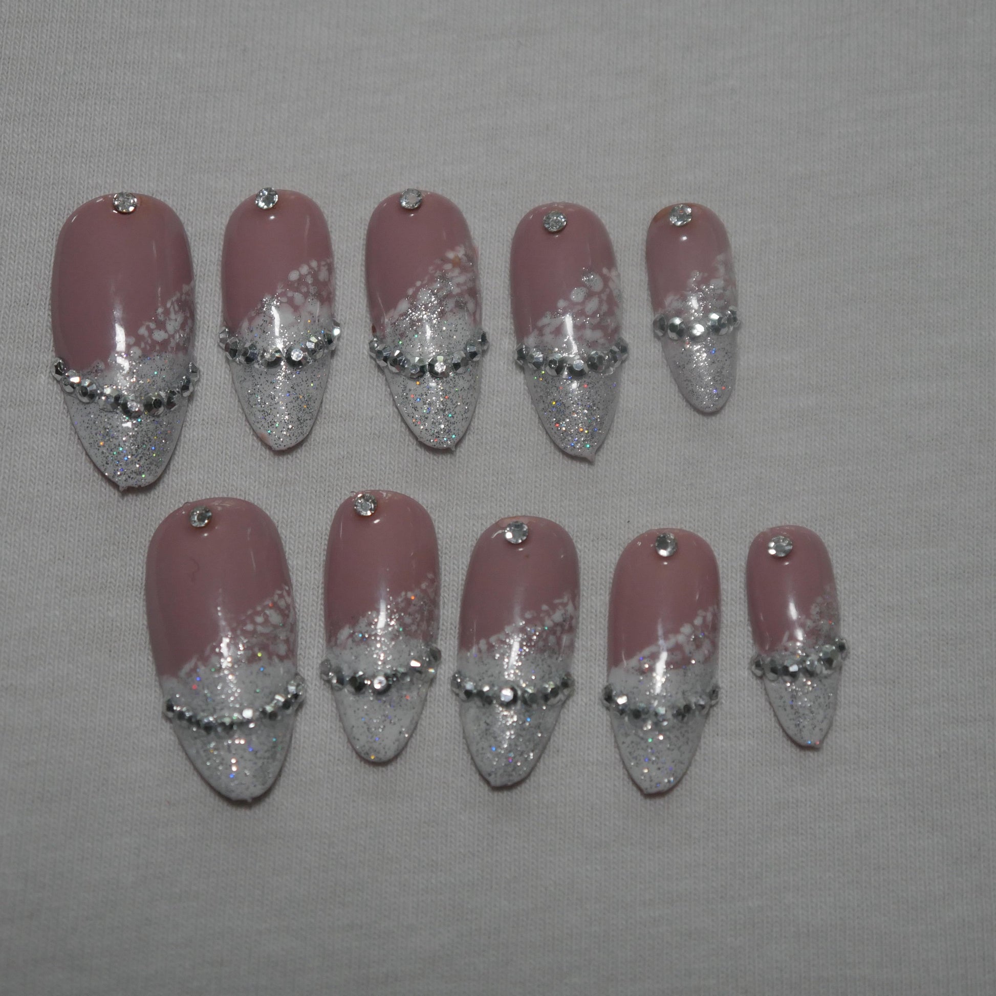 Refined, radiant, and unapologetically luxe — this press-on set brings elevated glam to every gesture. Featuring a soft nude-pink base, white sparkly tips, and delicately placed gemstone accents, these nails offer a flawless balance between elegance and edge.
